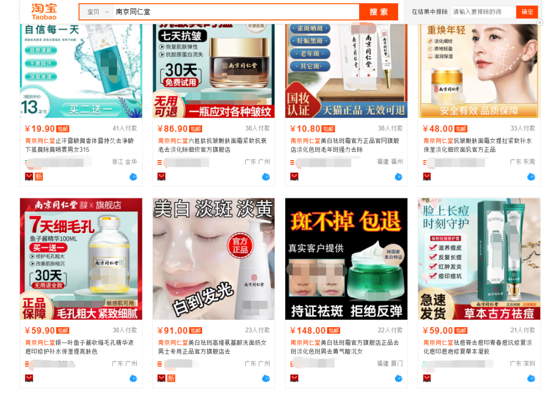 以淘宝为例,《化妆品观察》以“南京同仁堂”为关键词进行搜索,相关美妆产品近7500款。其中,一款“南京同仁堂韩某美白祛斑霜”,网页商品介绍显示其注册证号为国妆特字G2015XXXX。但在淘宝网上,该注册证号对应的产品,还有“云南本草韩某美白祛斑霜”“药都仁和韩某美白祛斑霜”。而国家药监局国产特殊化妆品注册信息平台显示,该注册证号对应的产品注册名为“韩某美白祛斑霜”,注册人、生产厂家均为广州市某某化妆品有限公司。